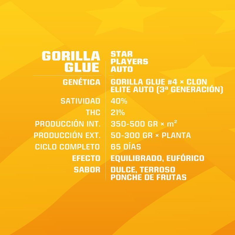 Gorilla Glue Auto es resultado del cruce de nuestro clon auto de 3ª generación con un clon elite Gorilla Glue #4, obteniendo una planta de estatura media y fácil cuidado, totalmente recomendable para principiantes ya que no necesita cuidados especiales, solo requiere estar bien fertilizada para recompensar con impresionantes cosechas. Entrega muestras de sabor dulce, a pino y a tierra, incluso a ponche de fruta en algunos ejemplares. Con un efecto equilibrado que en un principio es euforizante, para luego relajarte plácidamente.