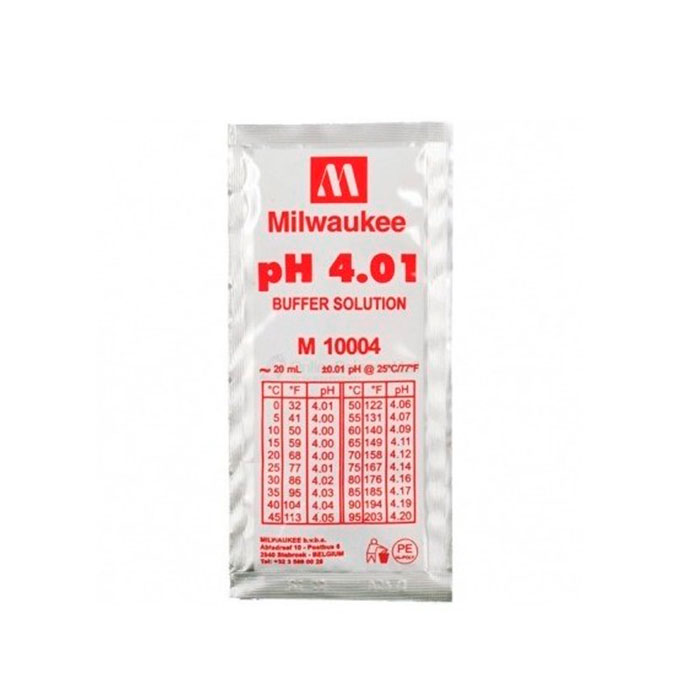 Líquido Calibrador PH 4.01 de la marca Milwaukee en sobres de 20 mililitros para llevar a cabo la calibración de medidor digitales de EC (Electro conductividad).